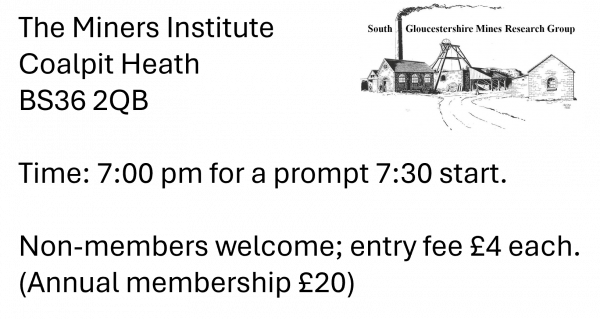 The Miners Institute, Coalpit Heath (Location), 7:00 pm for a prompt 7:30 pm start.